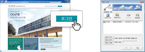사이트에 접속 한 후, [로그인] 버튼을 클릭하면 공인인증서 확인 창이 나타납니다.
