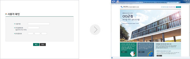 최초 로그인 시 또는 인증서를 교체 선택한 경우만 사용자 확인 창이 나타납니다. 입력 항목을 입력하고 [확인] 버튼을 클릭하면 휴대폰 인증을 거쳐 사용자 확인 절차가 수행됩니다. 사용자 확인 절차가 정상적으로 수행된 경우 사이트 메인으로 들어갑니다.